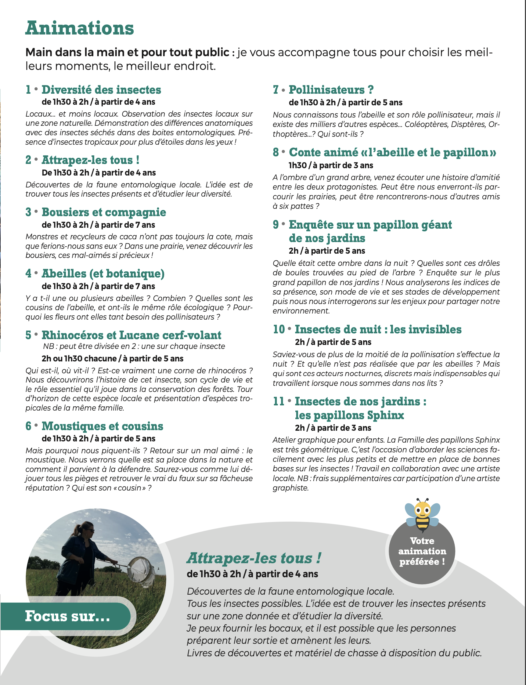L’idée de ces animations, entre 1h30 et 2h selon vos besoins, est de découvrir les insectes dans leur milieu, sur votre commune, dans les petits chemins, au bord des mares, dans les espaces verts où les zones laissées en jachère, pour découvrir le patrimoine naturel à portée de main.
